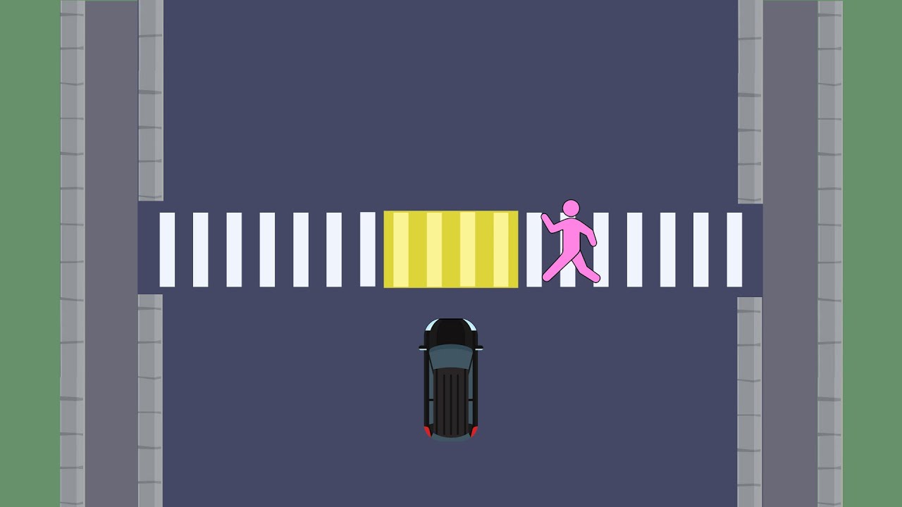 車両等がそのまま進行すると、その歩行者の横断を妨げることとなるような横断歩行者と解する。具体的事例に当てはめてみると、次のようになる(歩行者の進行速度を毎秒1メートルとした場合)。