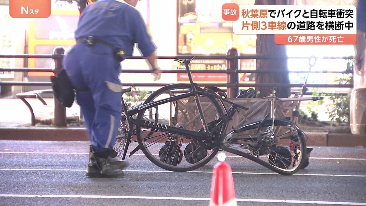 きのう夜、東京・秋葉原でバイクと自転車が衝突する事故があり、自転車に乗っていた67歳の男性が死亡しました。
