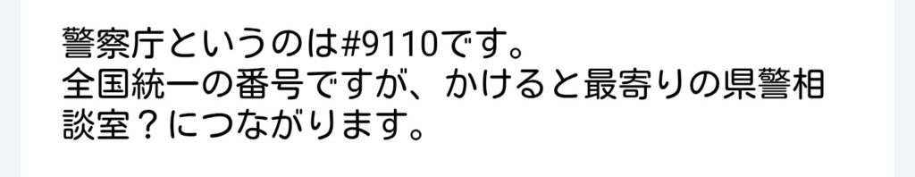 警察庁が展開する#9110(警察相談専用電話 地域の警察本部などにつながる)に確認して集まった回答が以下となる。