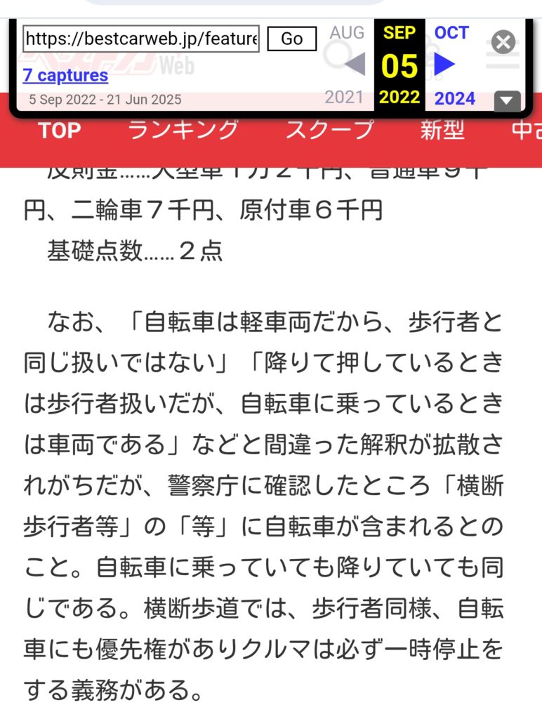 なお、「自転車は軽車両だから、歩行者と同じ扱いではない」「降りて押しているときは歩行者扱いだが、自転車に乗っているときは車両である」などと間違った解釈が拡散されがちだが、警察庁に確認したところ「横断歩行者等」の「等」に自転車が含まれるとのこと。自転車に乗っていても降りていても同じである。横断歩道では、歩行者同様、自転車にも優先権がありクルマは必ず一時停止をする義務がある。