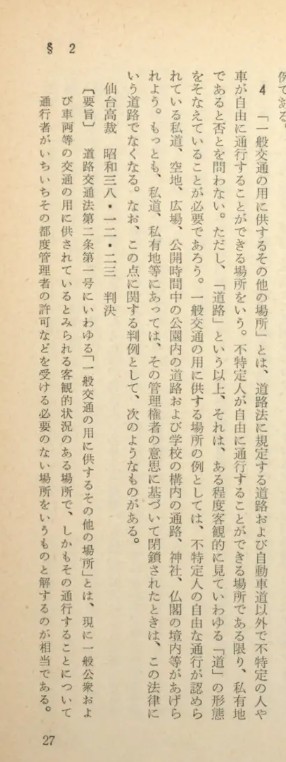 かように、道路交通法の目的・諸規定の立法趣旨にたちかえって考えれば、道路交通法の道路と認定された場所について、ある規定が適用され、ある規定が適用されないという結果が生じても不都合ではない。東京地方検察庁交通部研究会、最新道路交通法事典、東京法令出版、1974