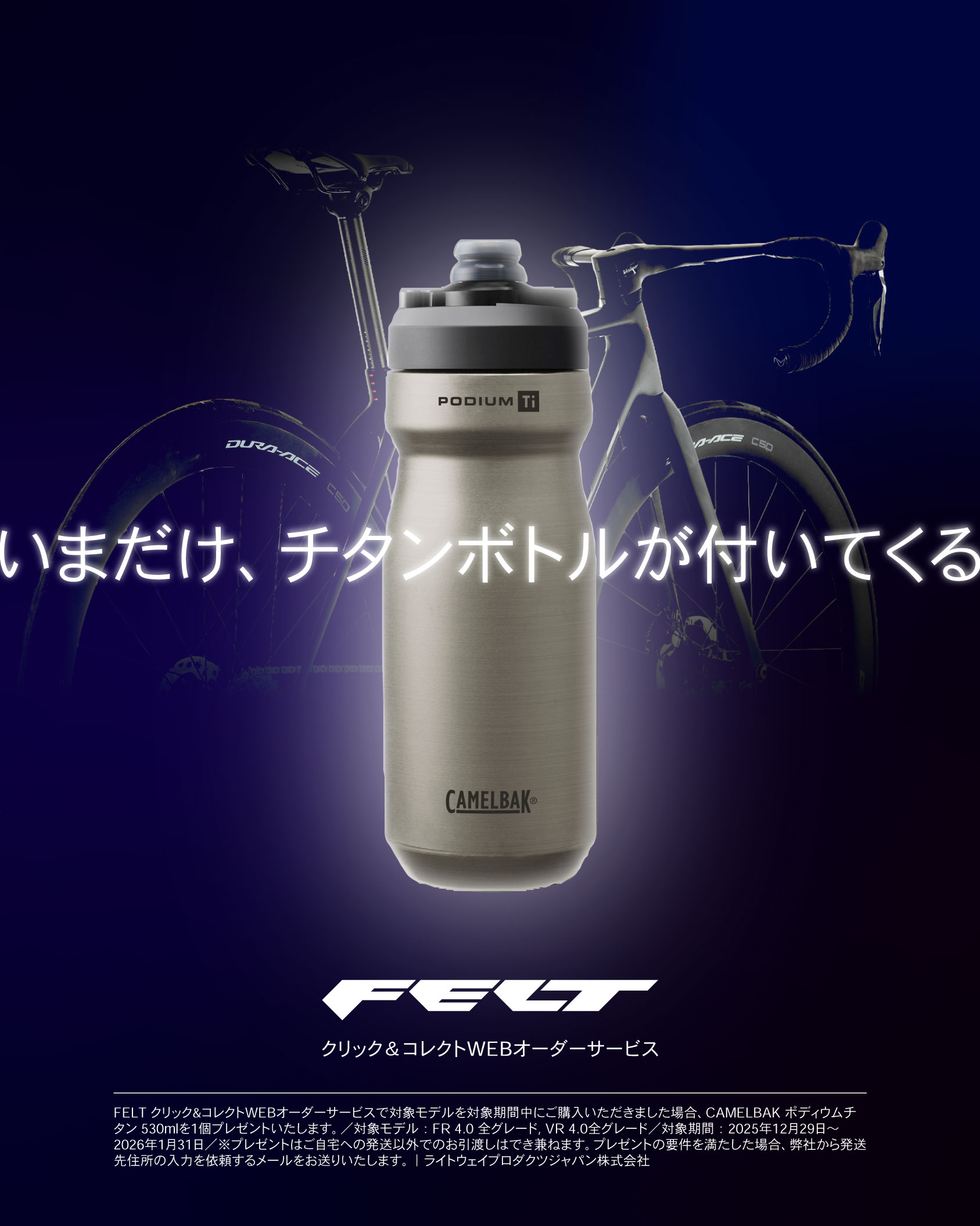 FELTがFR 4.0・VR 4.0を「FELTクリック&コレクト WEBオーダーサービス」にて購入した人に対し、キャメルバックのポディウムチタンサイクルボトルをプレゼントすると発表しました。