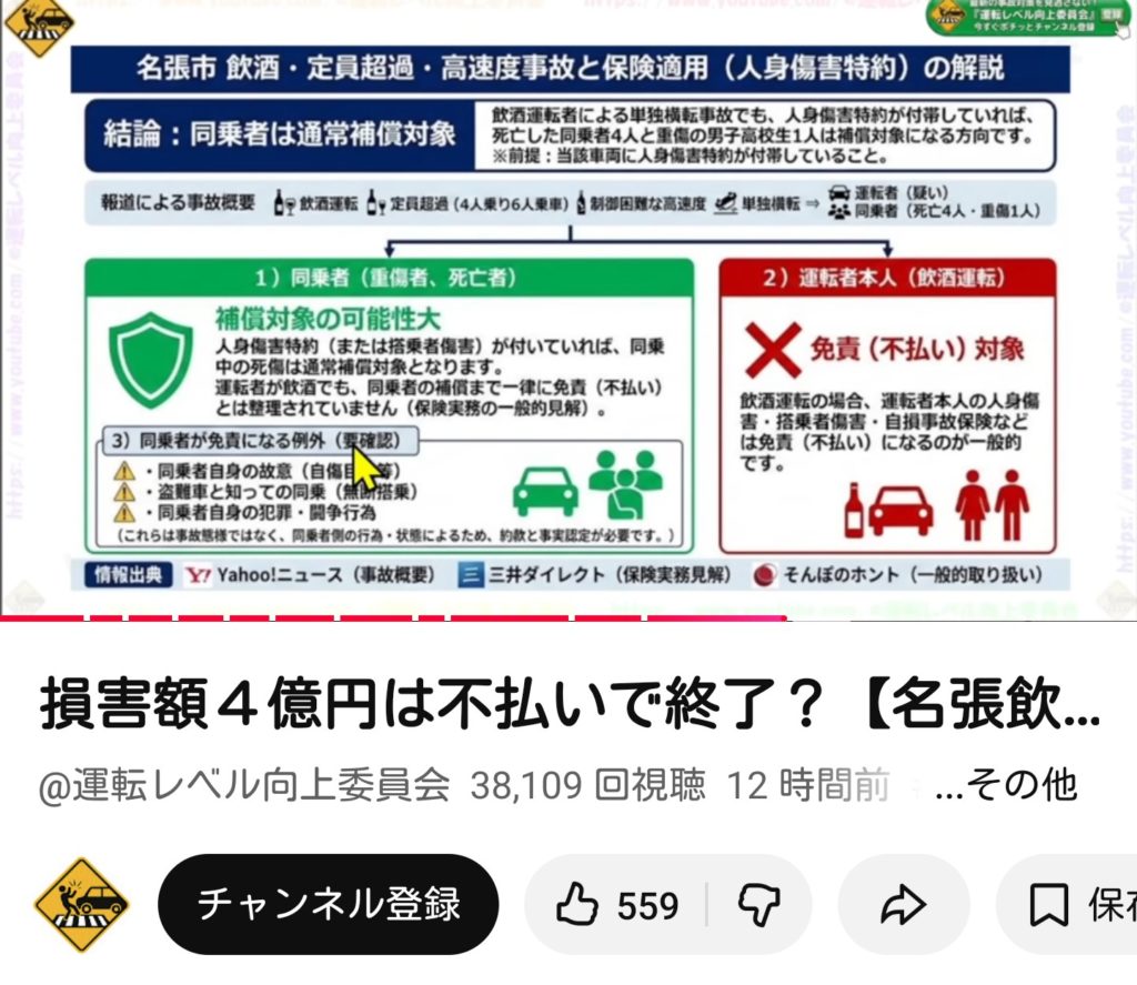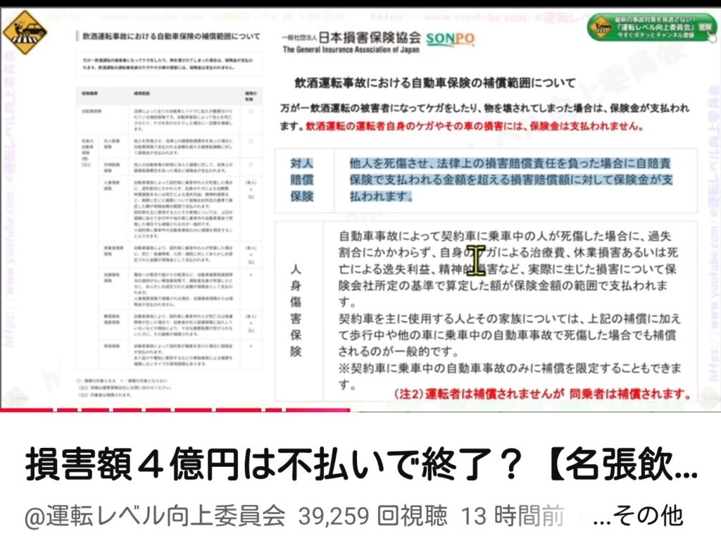 運転レベル向上委員会はうちを頻繁に見ているのに、なぜか「人身傷害保険は支払われる可能性が高い」という判例とは真逆の話をしている(事案は定員オーバーで、運転者が酒気帯び運転と考えられる事故)。