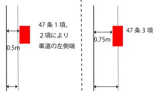 こちらで取り上げた路側帯の駐停車ルールが誤りではないか?と指摘を受けたのですが、えーと、これ間違いやすいけどあってます。路側帯が0.75m以下進入禁止の路側帯路側帯が0.75mより広い場合車道の左側端(47条1/2項)車道の左側端(47条1...